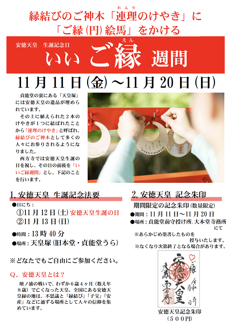 貞能堂の裏にある「天皇塚」には安徳天皇の遺品が埋められています。 その上に植えられた2本のけやきが1つに結ばれたことから「連理(れんり)のけやき」と呼ばれ、縁結びのご神木として多くの人にお参りされるようになりました。 西方寺では安徳天皇生誕の日を祝し、その日の前後を「いいご縁週間」とし、下記のことをおこないます。