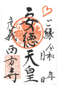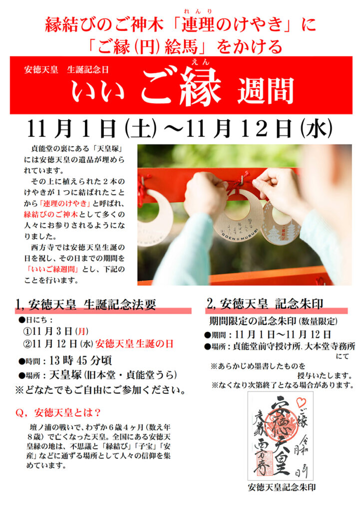 貞能堂の裏にある「天皇塚」には安徳天皇の遺品が埋められています。 その上に植えられた2本のけやきが1つに結ばれたことから「連理(れんり)のけやき」と呼ばれ、縁結びのご神木として多くの人にお参りされるようになりました。 西方寺では安徳天皇生誕の日を祝し、その日までの期間を「いいご縁週間」とし、下記のことをおこないます。